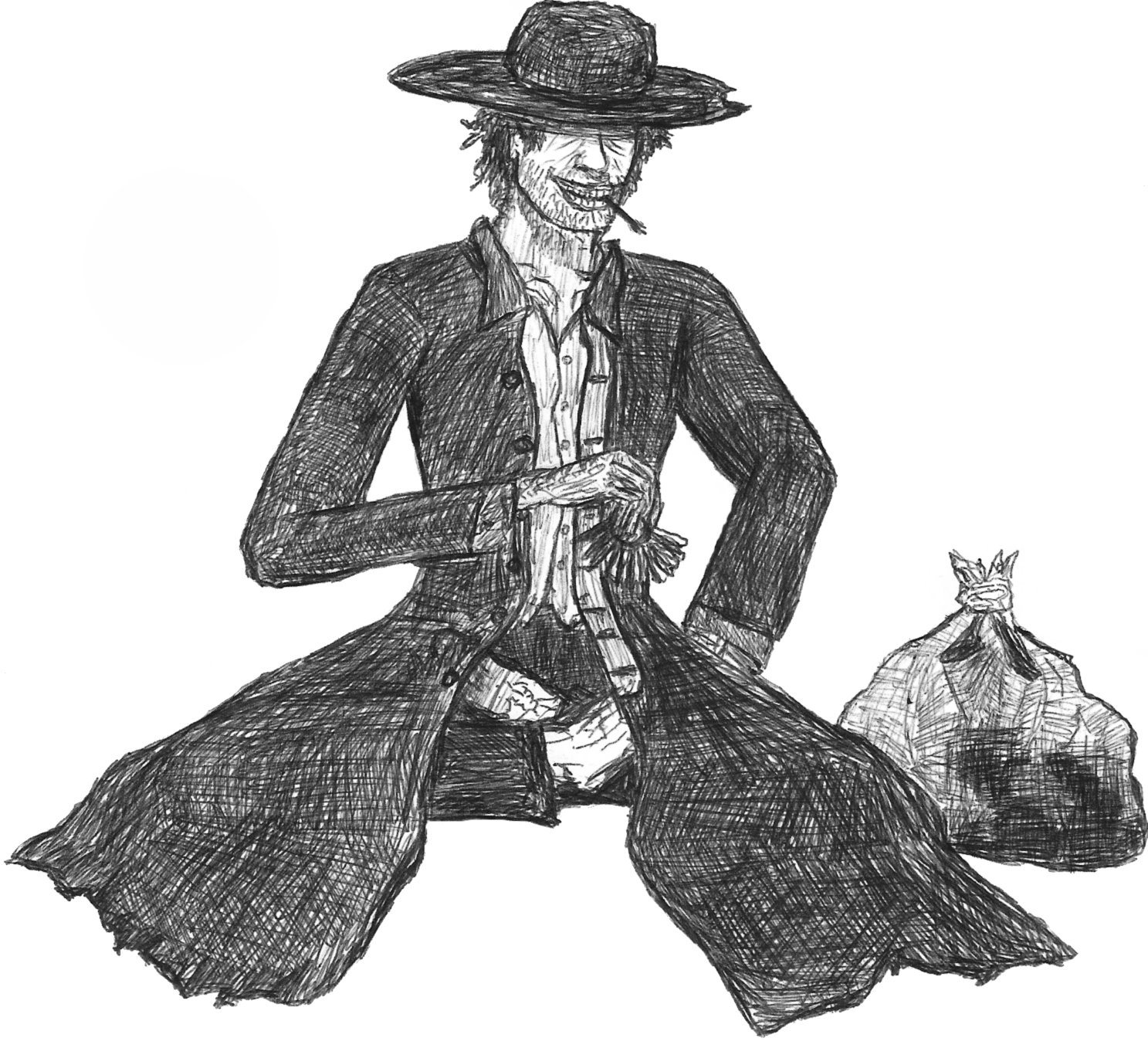 He smiled warmly at me, winked one last time, and hoisted a filthy burlap sack to his shoulder. A few feet down the road, he turned and tipped his hat to me, sending a little flurry of snow down that obscured his face, and then he was gone, swallowed up into the swirling whiteness.