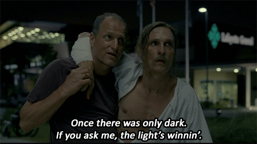 Stars in the dark, that represent hope, and resisting the dark. They completely flip a central metaphor. Inside out. I would wager the whole Black Stars metaphor was planned to lead to this moment from its initial conception. (Actually, no need to wager, as I just found that the writer admitted as much.) Rust rejects the darkness and identifies himself with the light that resists. It’s the only possible and appropriate happy ending. And, really, it’s not terribly happy. But it’s elegant and honest, and I love it.